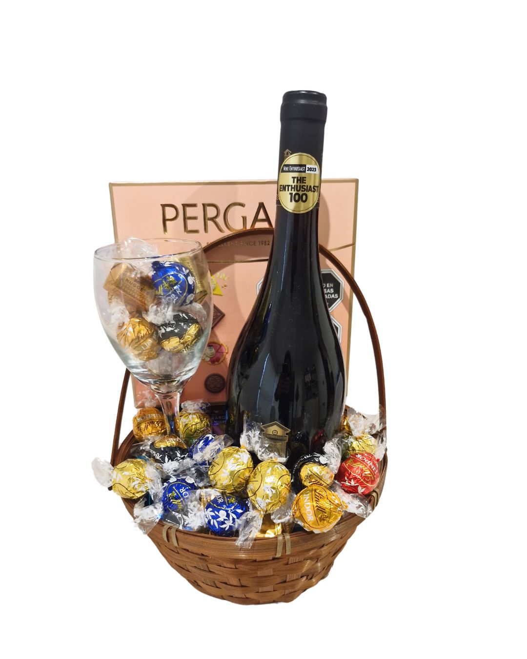 Sorprende con una experiencia dulce y elegante. Este canasto incluye un exquisito Vino una copa de vidrio y una selección de bombones Lindt junto a una caja de finos chocolates Pergale. Ideal para celebrar, agradecer o simplemente disfrutar un momento especial. Perfecto para cumpleaños, aniversarios o el Día de la Madre.